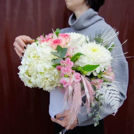 Подарочная композиция из пионовидной розы, альстромерии и диантусами «
