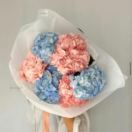 Букет из гортензий, диантусов, самшита, цимбидиума, роз, эустомы и лимониума в стильной упаковке “Сидней”