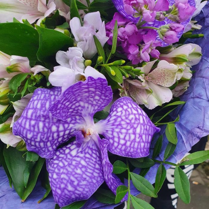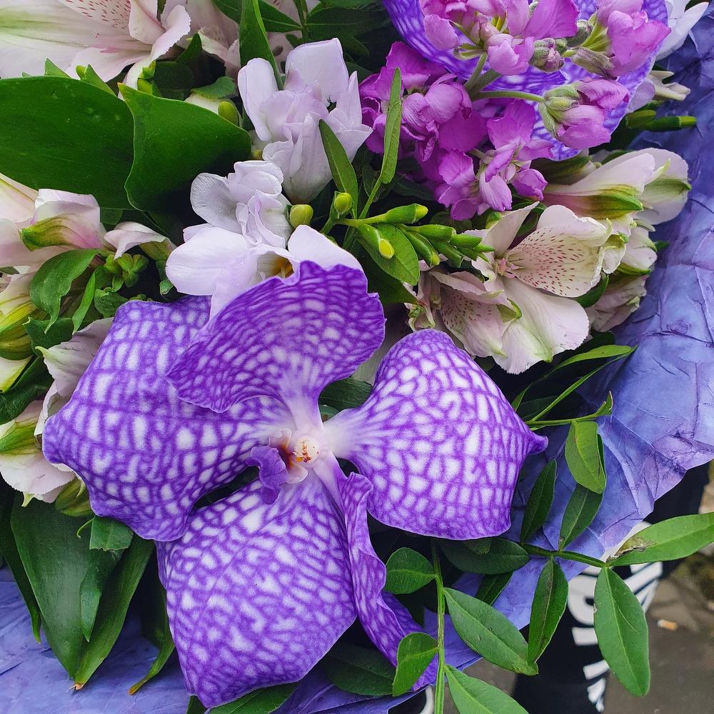 Ванда орхидея – 5 шт.Альстромерия – 7 шт.Фрезия – 5 шт.Маттиола – 7 шт.Снежноягодник – 3 шт.Фисташка – 1 шт.Рускус – 1 шт.Упаковка – 2 шт.