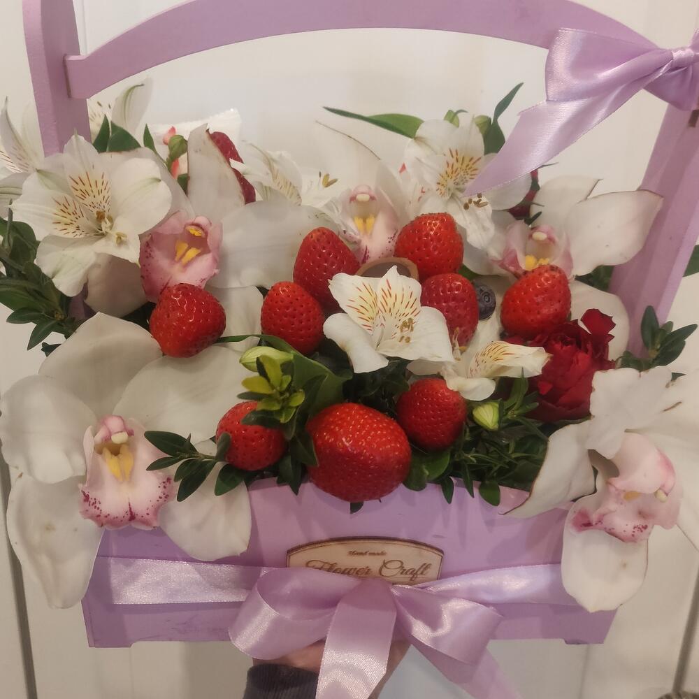 Альстромерия – 5 шт.орхидея – 5 шт.Клубника – 500 гр.коробочка деревянная – 1 шт.
