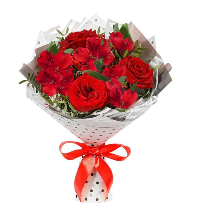 Фисташка – 1 шт.лента атласная (красный) – 1 шт.пленка цветная – 1 шт.альстромерия (красный) – 5 шт.