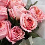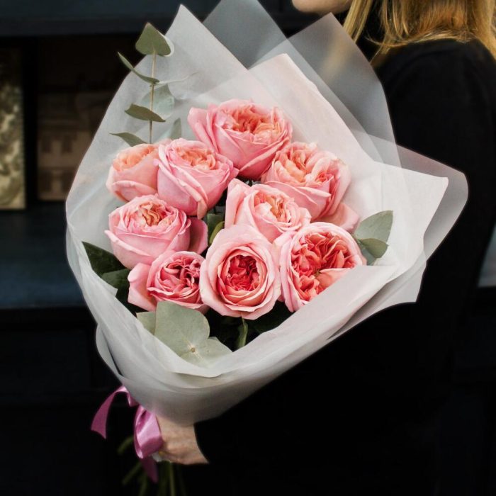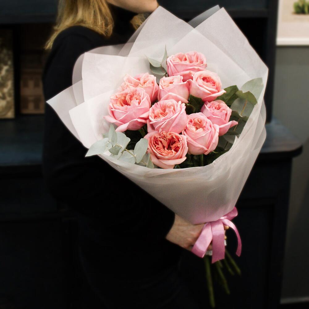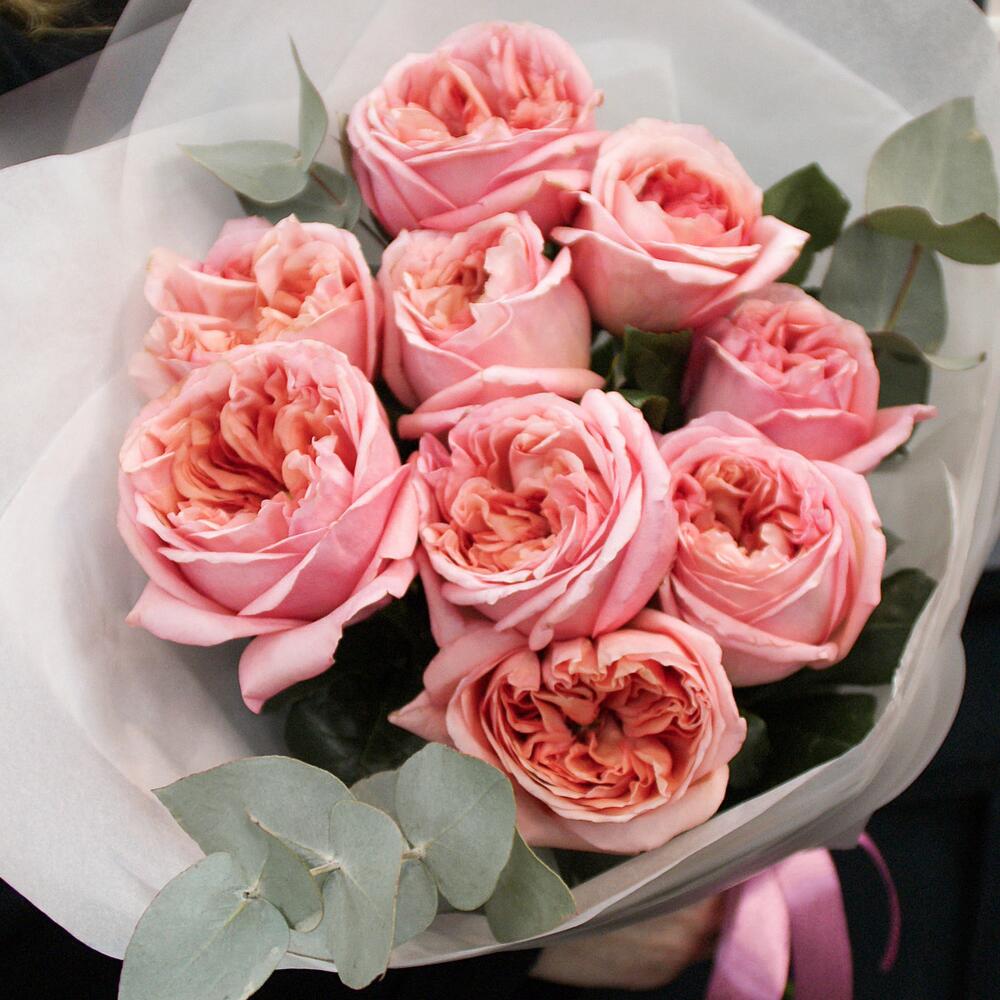 9 розовых пионовидных роз с эвкалиптом