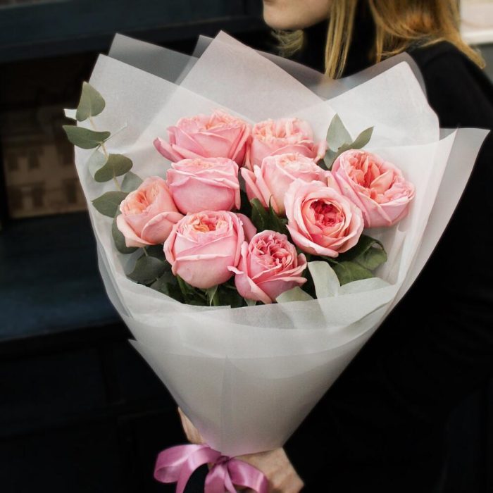 Эвкалипт – 2 шт.Тишью – 1 шт.Атласная лента – 2 шт.Матовая пленка – 1 шт.пионовидные розы – 9 шт.