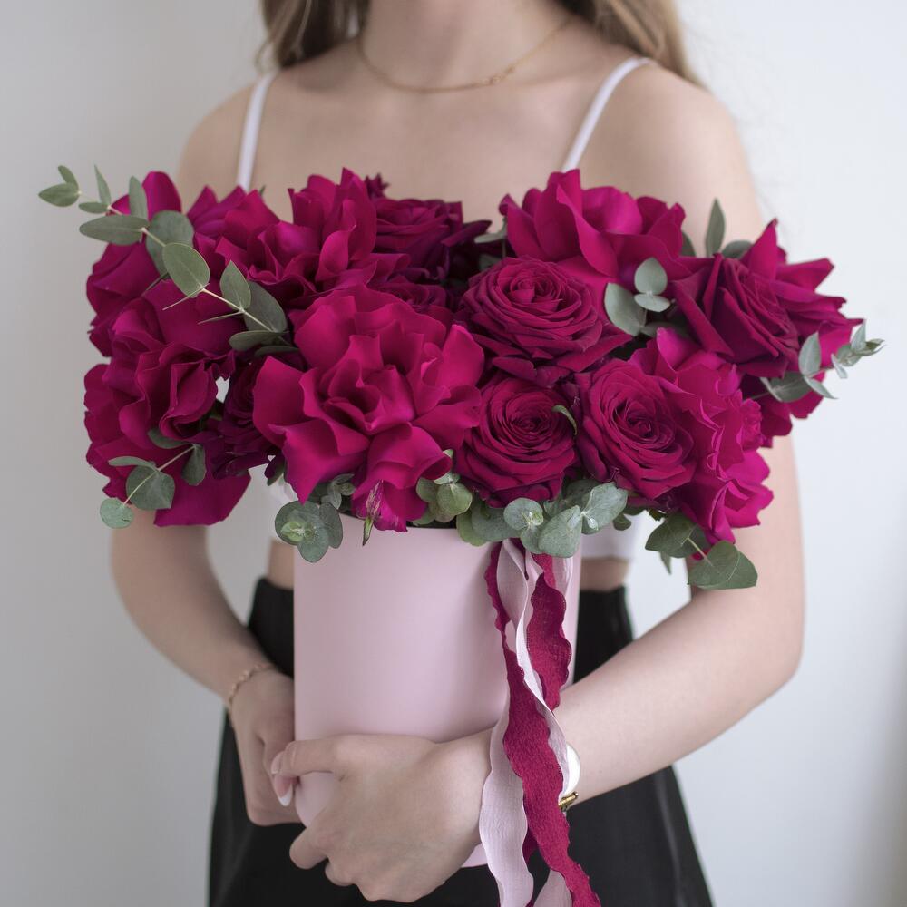 розы французские готча – 7 шт.розы красные red naomi – 10 шт.Эвкалипт цинерея – 5 шт.Коробка шляпная – 1 шт.
