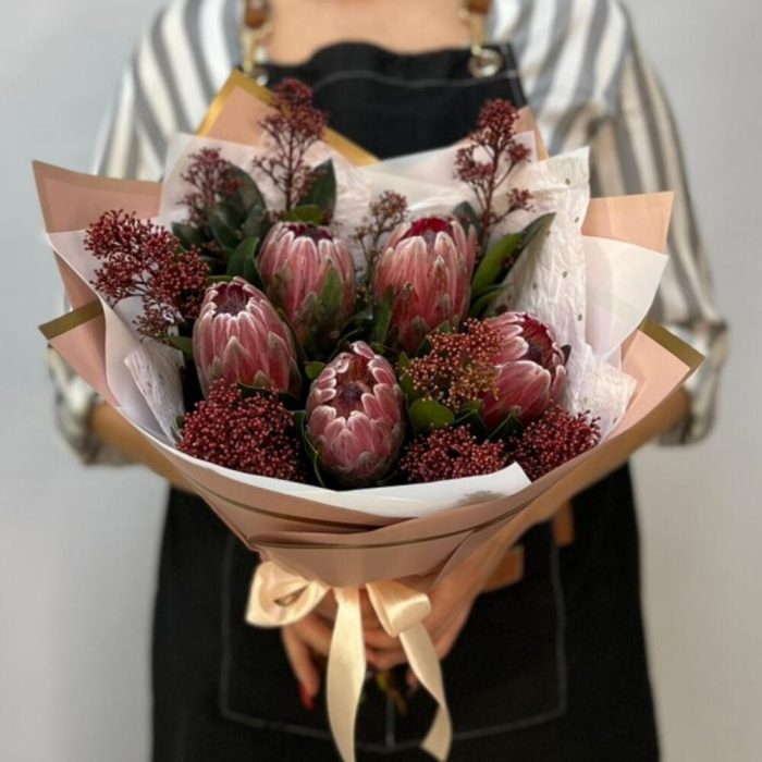 Прекрасный, экзотический и очень стойкий букет из протеи и скимии! Отлично подойдёт для коллеги, и близкого человека. Букет хорошо смотрится в качестве основного подарка, и может быть как дополнение к основному подарку.