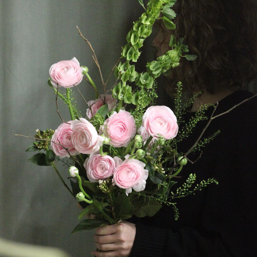 Букет с нежными ранункулюсами, ирландскими колокольчиками, ветвями и пастушьей сумкой.