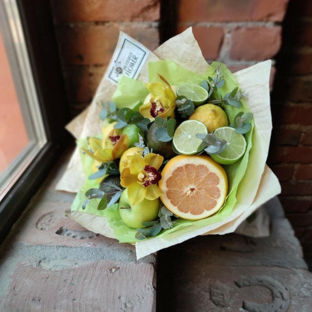 Эвкалипт – 5 шт.Лента атласная – 1 шт.Яблоко – 1 шт.Крафт – 1 шт.Лайм – 5 шт.Лимон – 4 шт.Авокадо – 2 шт.Грейпфрут – 1 шт.Цимбидиум зеленый – 3 шт.Айва – 1 шт.