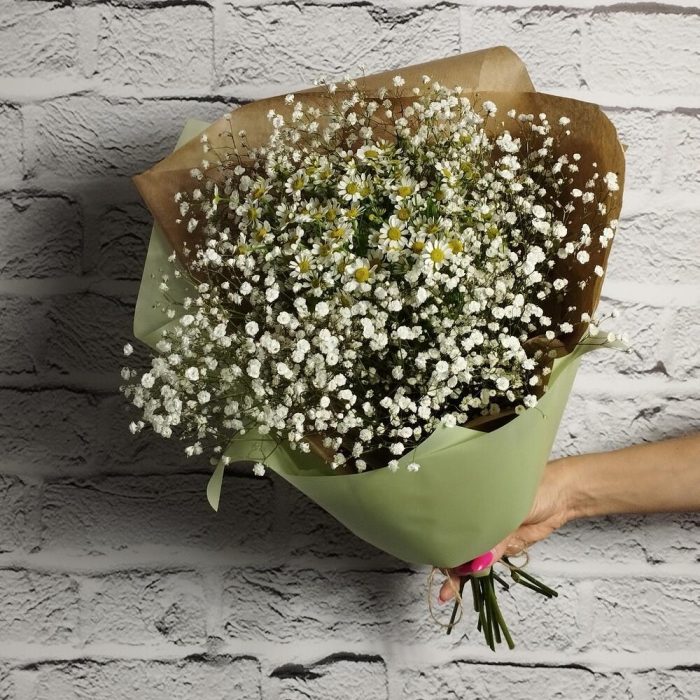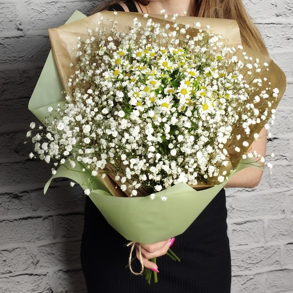 Матрикария (Ромашка Камила) – 5 шт.Гипсофила – 5 шт.Упаковка – 1 шт.Лента атласная – 1 шт.