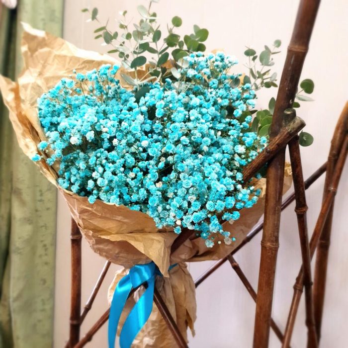 Гипсофила – 11 шт.Эвкалипт – 5 шт.Лента атласная – 1 шт.Открыточка с вашими пожеланиями – 1 шт.любовь флориста (бесплатно) – 1 шт.крафт жатый упаковка – 1 шт.