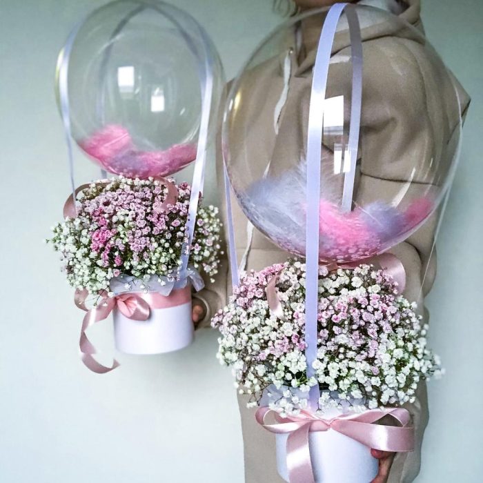 гипсофила цветная – 5 шт.шар баббл с перьями – 1 шт.Коробка шляпная – 1 шт.Лента атласная – 5 шт.Тишью – 1 шт.Упаковка транспортировочная пленка – 1 шт.инструкция по уходу за цветами – 1 шт.