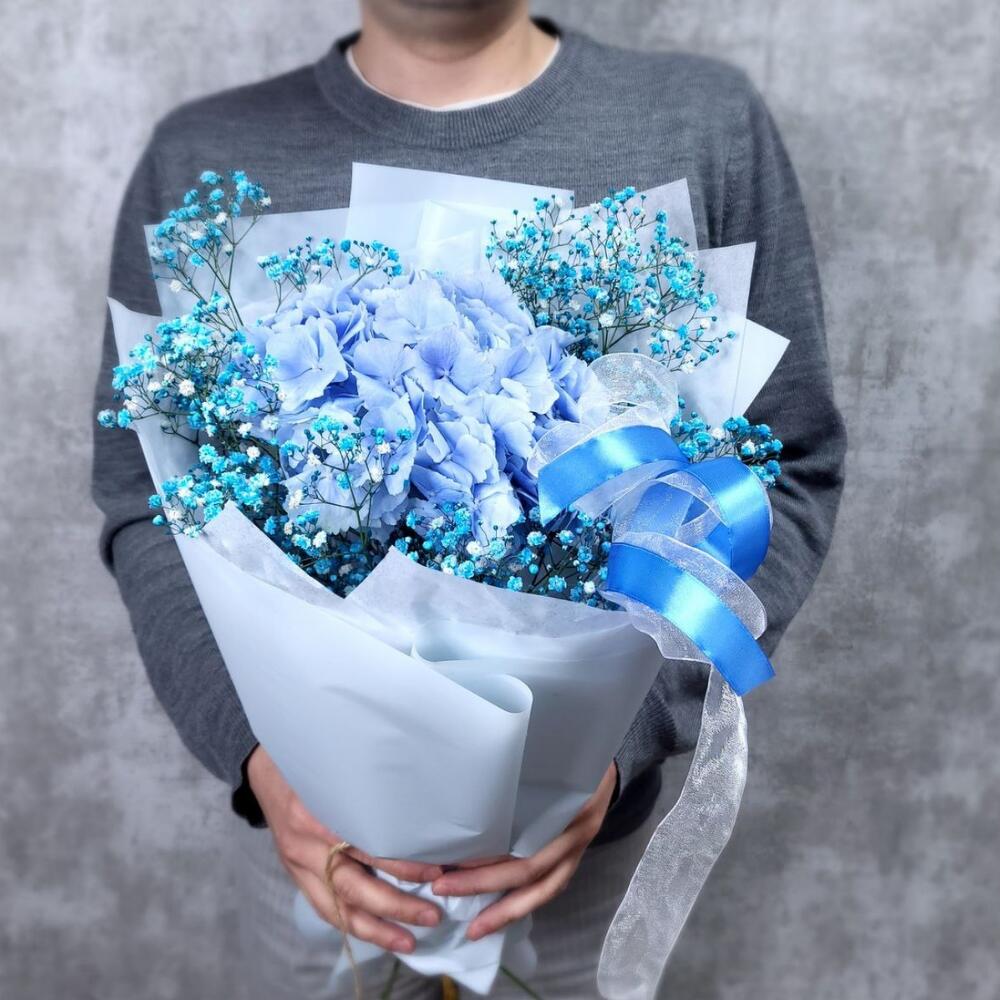Гипсофила – 2 шт.Гортензия – 1 шт.Лента атласная – 1 шт.Упаковка дизайнерская – 1 шт.