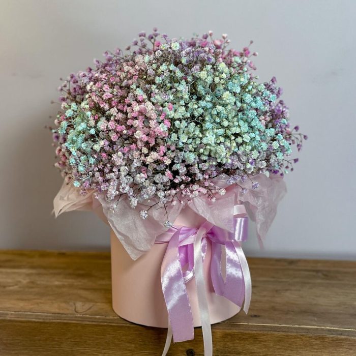 Композиция с радужной гипсофилой в декоративном ящике