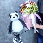Хлопок – 3 шт.Оазис – 1 шт.Шляпная коробка с лентами – 1 шт.Мягкая игрушка панда – 1 шт.гипсофила цветная – 6 шт.
