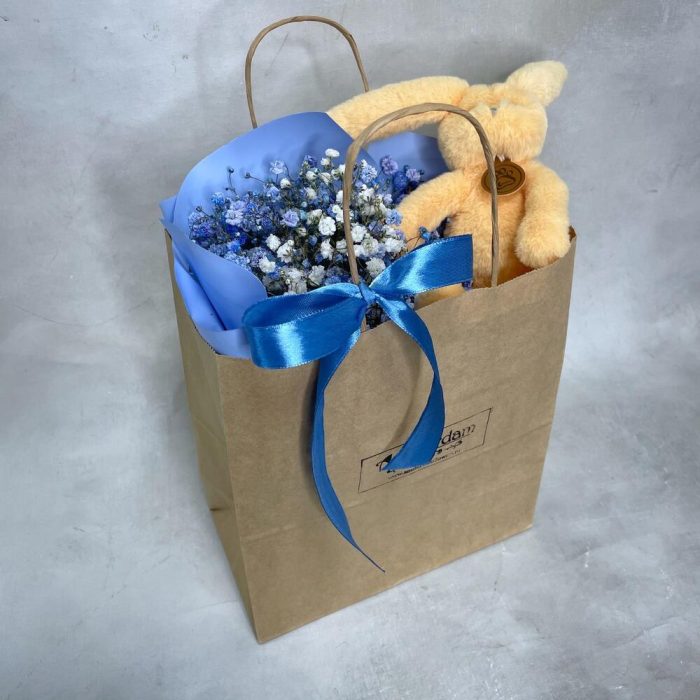 Подарочный набор – Букетик гипсофилы (размеры: 25 см высота, 20 см ширина) с мягкой игрушкой Lapkin. Доставляется в крафтовом пакете (высота 25 см, ширина 22 см, глубина 12 см).