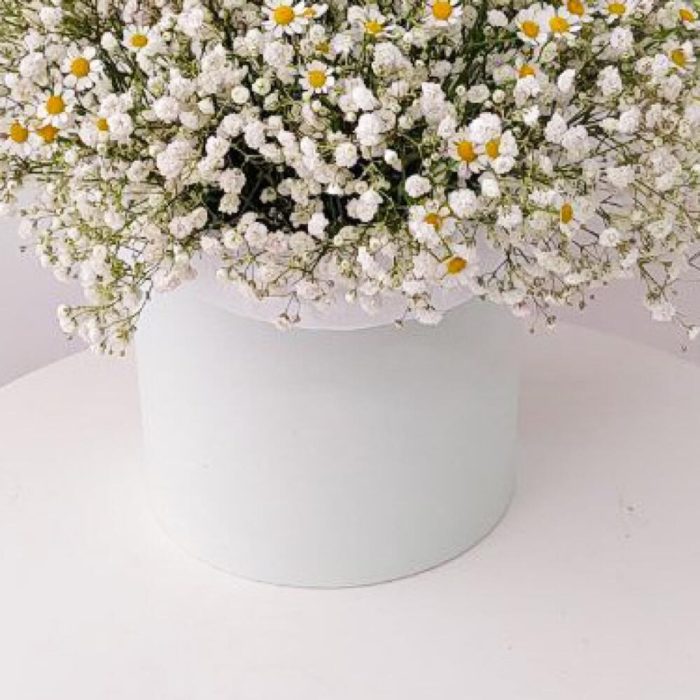 Стойкая композиция в шляпной коробке с белоснежной гипсофилой и ромашкой.Для придания изюминки Вы можете в дополнительных товарах выбрать сладкий сюрприз, вазу, воздушные шары и многое другое.Наши курьеры готовы привезти букет в ближайшие сроки. Закажите доставку и мы начнём работу!