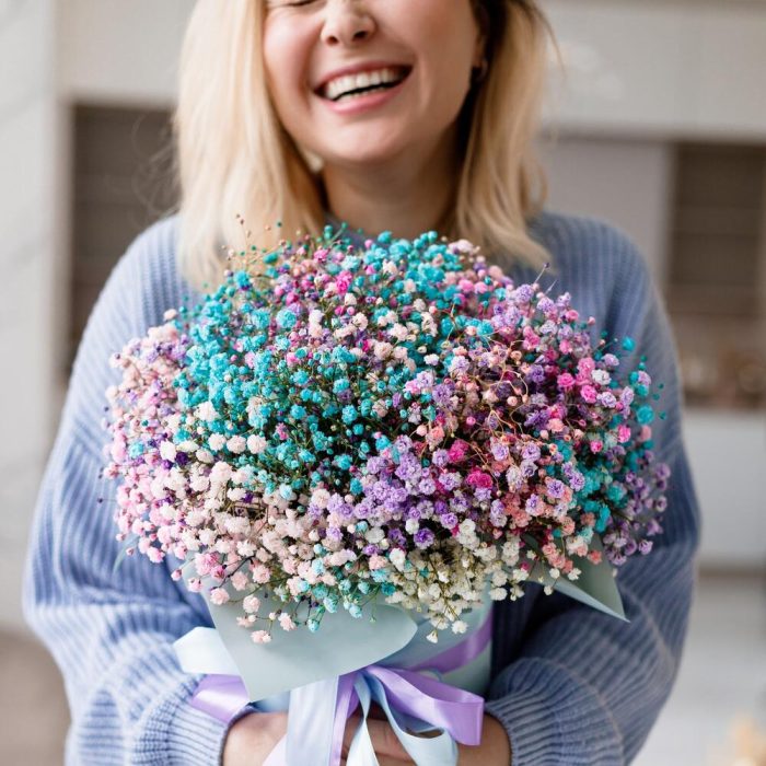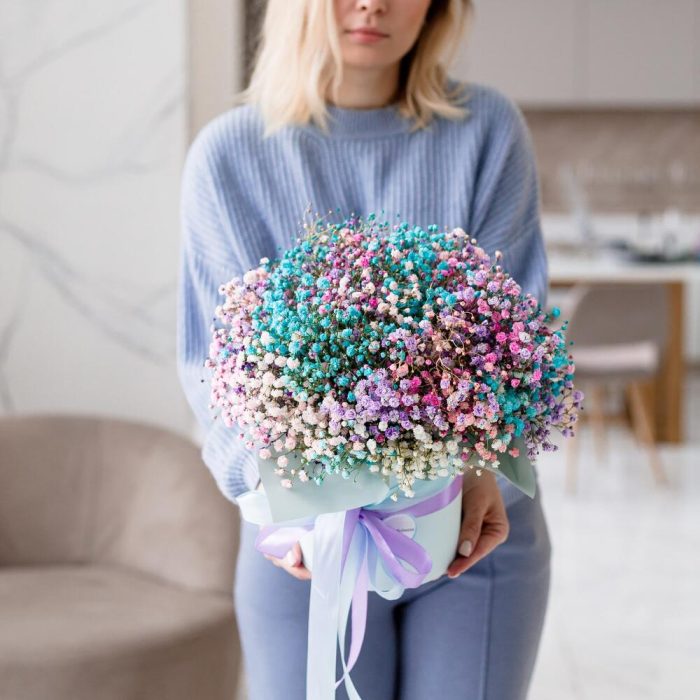 Лента атласная – 2 шт.Коробка шляпная – 1 шт.Оазис флористический – 2 шт.гипсофила радужная – 9 шт.