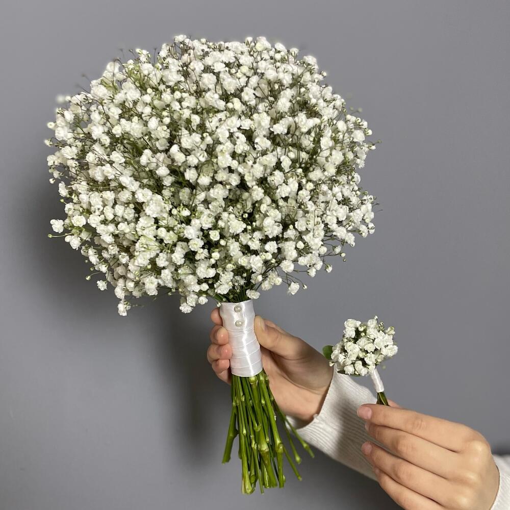Свадебный букет из гипсофилы + бутоньерка