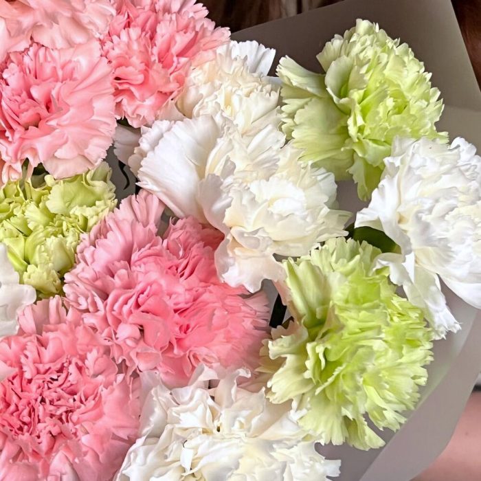 Лента – 1 шт.Диантус белый – 5 шт.Диантус розовый – 5 шт.Диантус салатовый – 5 шт.Дизайнерская упаковка – 1 шт.