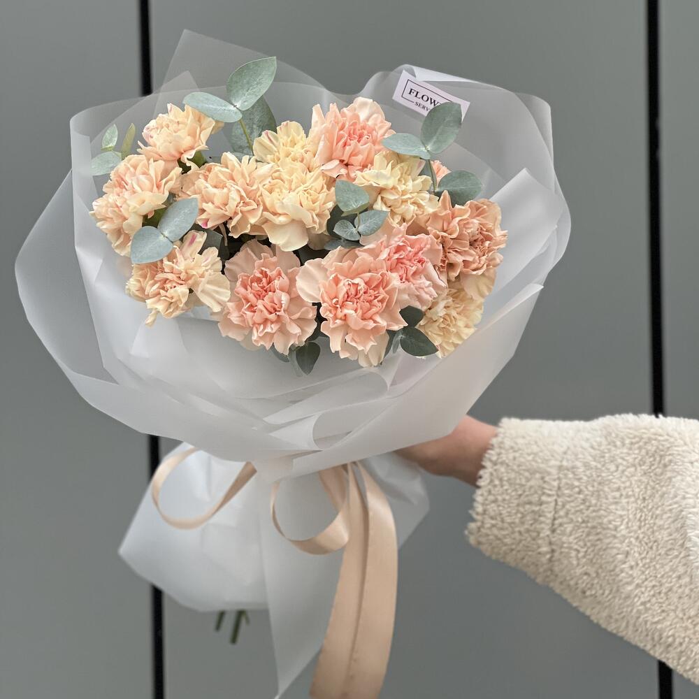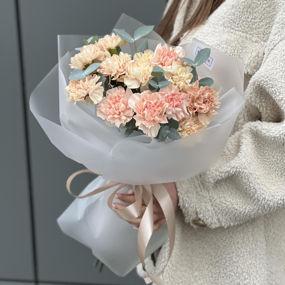 Эвкалипт – 1 шт. Оформление – 1 шт. гвоздика сортовая (диантус) – 15 шт.
