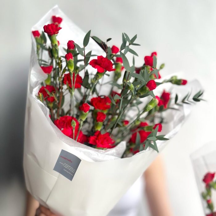 Эвкалипт – 2 шт.Гвоздика кустовая – 9 шт.Упаковка дизайнерская – 1 шт.Открытка – 1 шт.