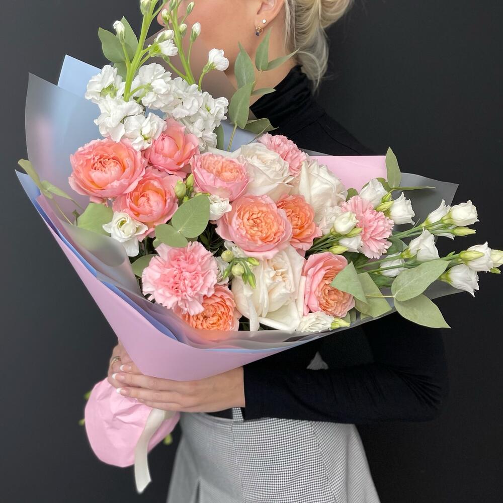 Лизиантус – 2 шт.Маттиола – 2 шт.Эвкалипт – 1 шт.Гвоздика – 3 шт.Фисташка – 3 шт.Упаковка дизайнерская – 3 шт