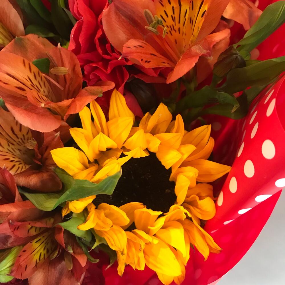 Категории: Альстромерии, Гвоздики, Подсолнухи