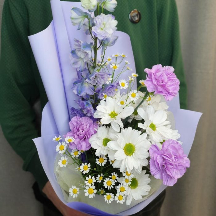 Дельфиниум – 1 шт.Матрикария (Ромашка Камила) – 2 шт.Хризантема кустовая – 1 шт.Диантус – 3 шт.