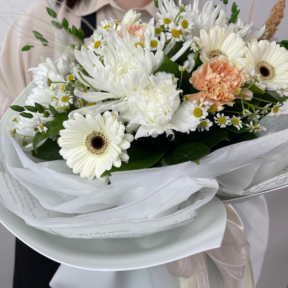 Матрикария – 5 шт.Диантус – 5 шт.Гербера – 5 шт.Хризантема – 3 шт.Салал пучок – 1 шт.фаомиран – 2 шт.Тишью – 6 шт.Лента атласная – 2 шт.бриза пучок – 1 шт.