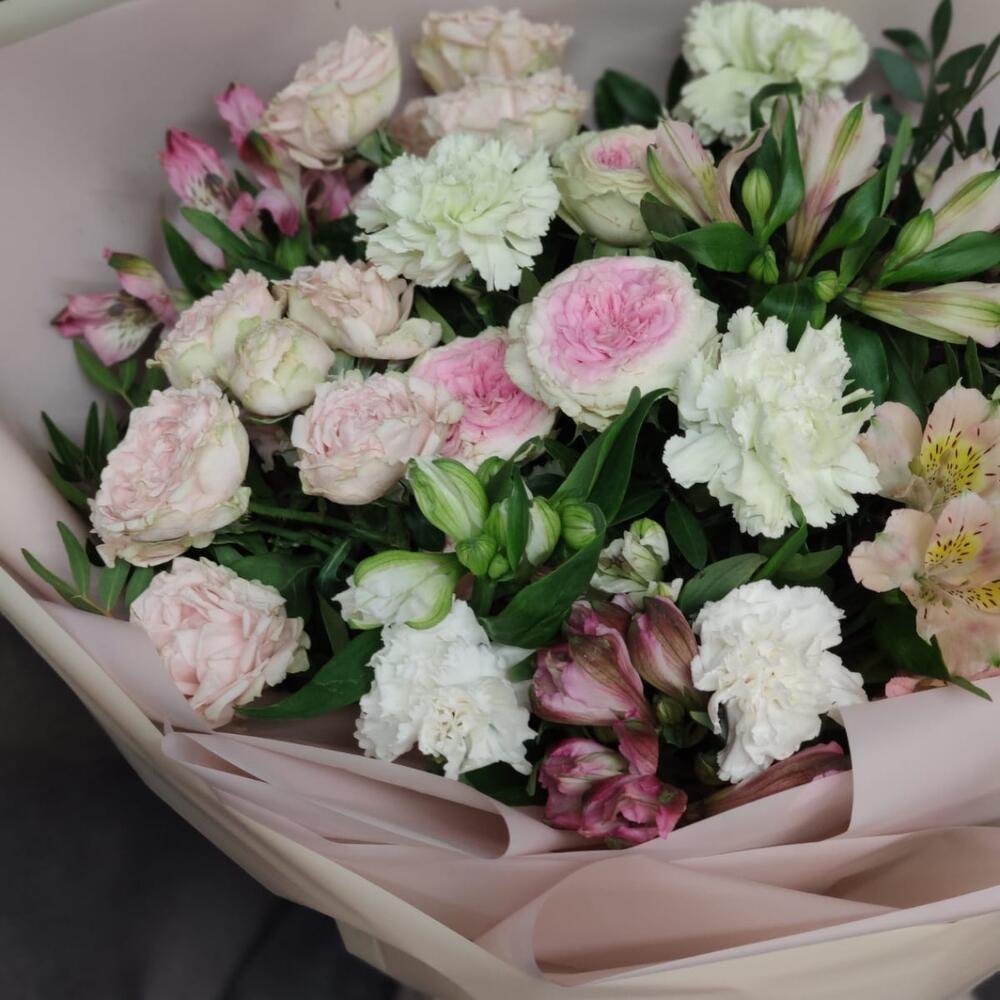 Роза кустовая – 4 шт.Альстромерия – 5 шт.Гвоздика – 5 шт.Упаковка дизайнерская – 1 шт.зелень декоративная – 3 шт.