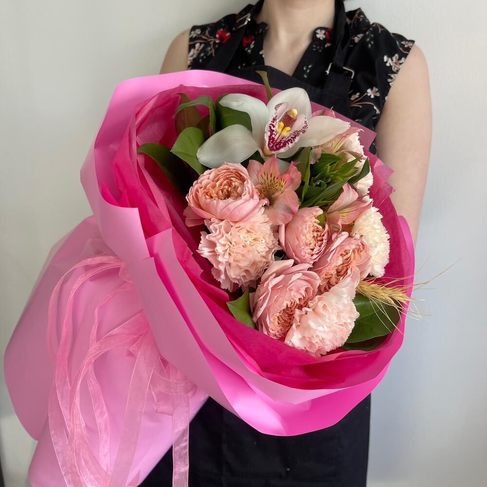 Альстромерия – 1 шт.Орхидея Цимбидиум – 1 шт.Лента атласная – 2 шт.Диантус – 4 шт.Пленка матовая – 6 шт.джульетта – 1 шт.Салал пучок – 1 шт.Пшеница (сухоцвет) – 1 шт.