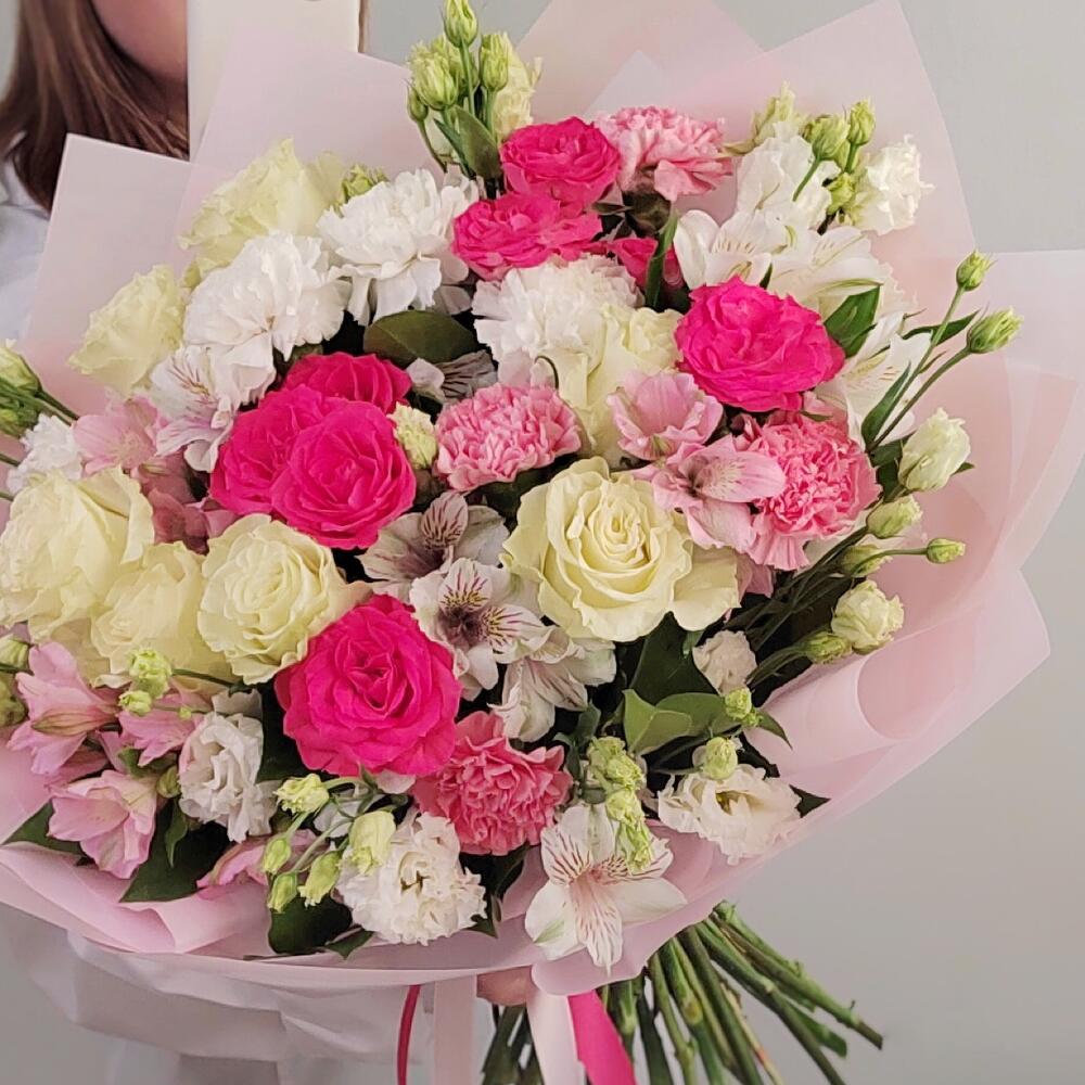 Альстромерия – 7 шт.Салал – 15 шт.Лента атласная – 10 шт.Роза кустовая пионовидная – 2 шт.Гвоздика сортовая – 7 шт.Упаковка дизайнерская – 8 шт.эустома белая – 5 шт.Роза одноголовая эквадор – 7 шт.