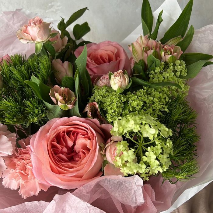 Альстромерия – 2 шт.Вибурнум – 1 шт.Роза кустовая – 1 шт.Гвоздика – 3 шт.Роза пионовидная – 3 шт.Упаковка дизайнерская – 1 шт.гринтрик – 2 шт.