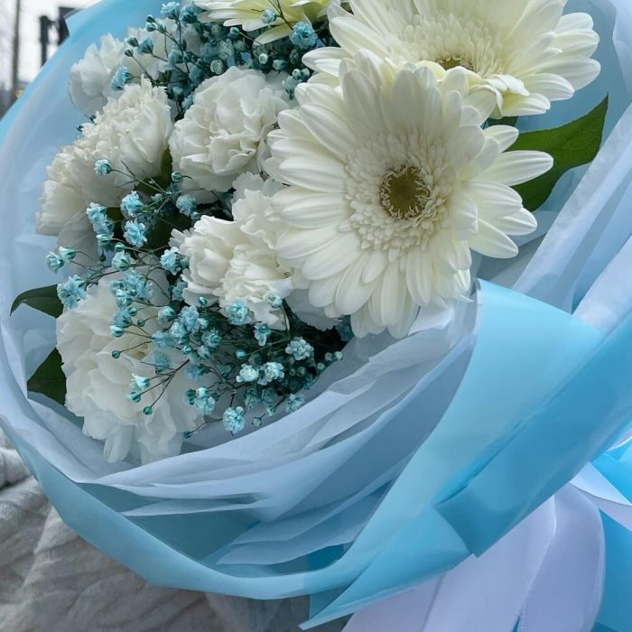 Голубой воздушный букет с герберами и диантусом