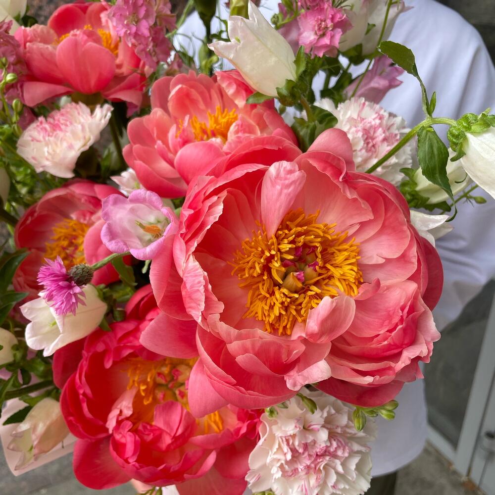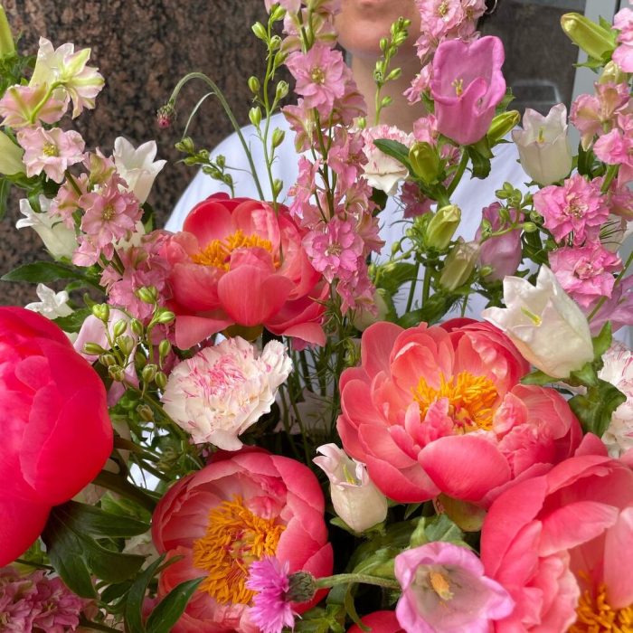 Дельфиниум – 5 шт.Кампанула – 5 шт.Пион Коралл Шарм (Coral Charm) – 7 шт.Диантус – 7 шт.Коробка шляпная – 1 шт.Оазис – 1 шт.василек – 3 шт.Лента бархат – 1 шт.сезонная зелень – 2 шт.