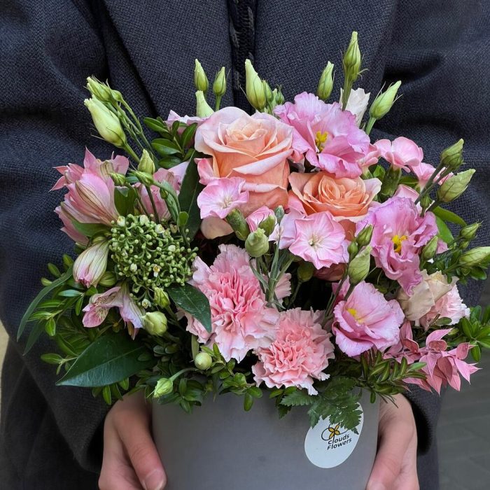 Роза шиммер – 2 шт.гвоздика соломио – 2 шт.Гвоздика – 5 шт.Лизиантус – 2 шт.Чойсия – 1 шт.Рускус – 1 шт.Скиммия – 2 шт.Альстромерия – 1 шт.Самшит – 2 шт.