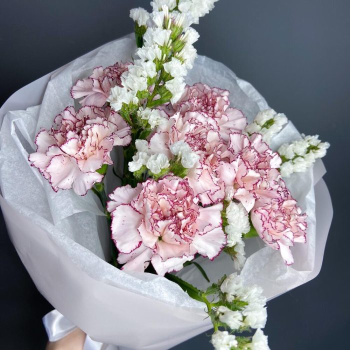 Невероятной стойкий букет с необычными гвоздиками и белыми веточками статица будет долго радовать и удивлять свою получательницу