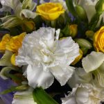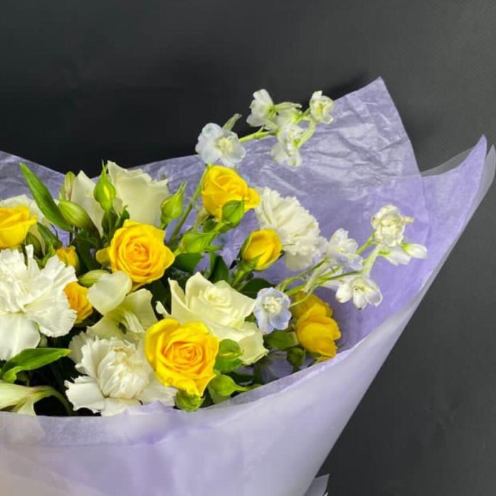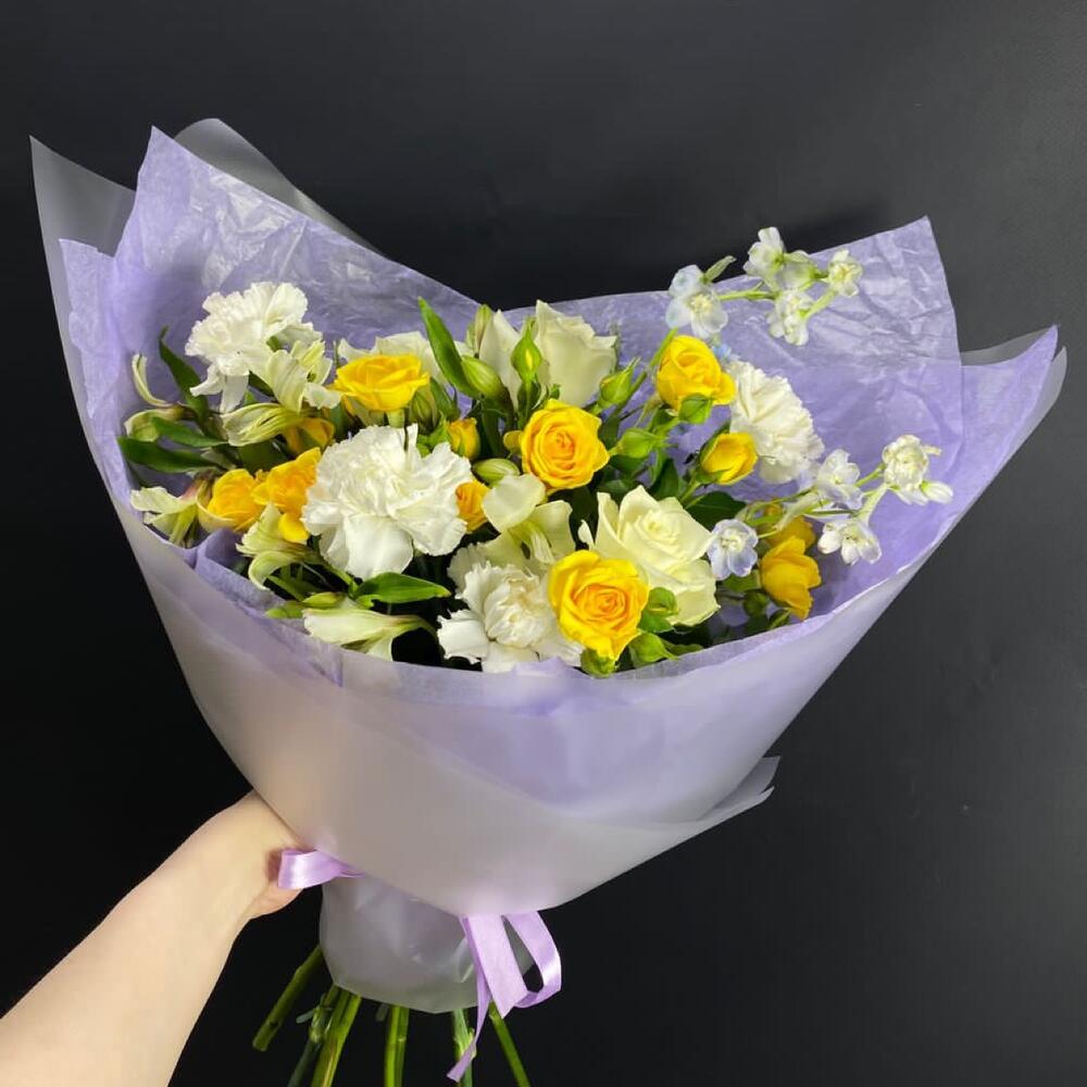 Альстромерия – 3 шт.Роза одноголовая – 3 шт.Роза кустовая желтая – 3 шт.Гвоздика одноголовая – 4 шт.Дельфиниум синий – 2 шт.фисташка зелень – 2 шт.