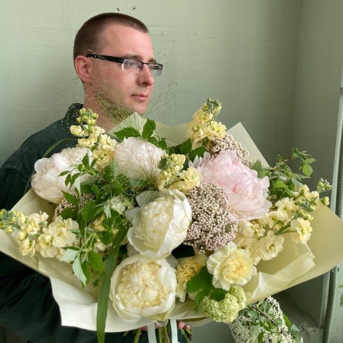 Пион – 5 шт.Паникум – 3 шт.Маттиола – 6 шт.Гвоздика – 3 шт.Озотамнус – 3 шт.Ветки малины – 3 шт.Упаковка – 1 шт.