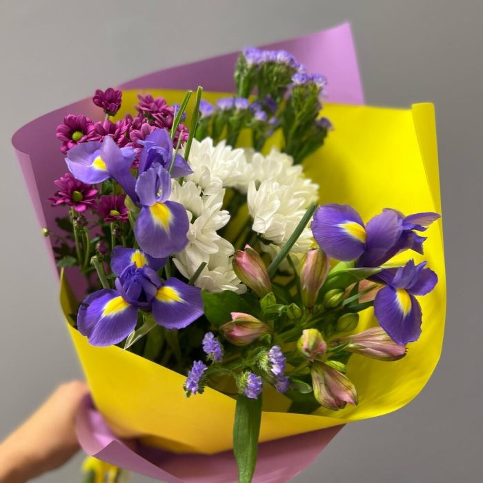 Ирис – 3 шт.Альстромерия – 1 шт.Хризантема кустовая – 2 шт.Статица – 2 шт.Упаковка дизайнерская – 2 шт.Лента атласная – 1 шт.