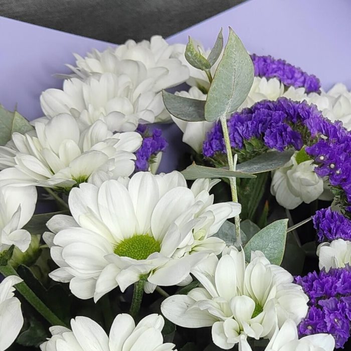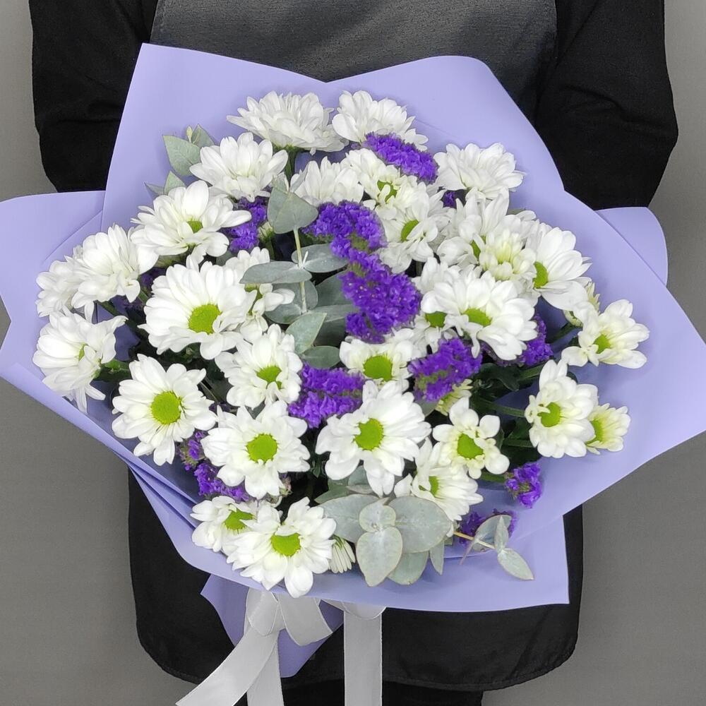 Букет из ромашковой хризантемы, статицы и эвкалипта “Счастье”