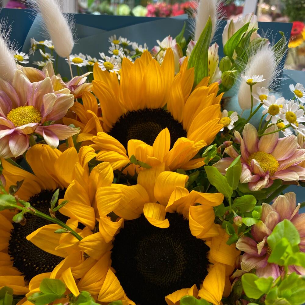 Подсолнух – 3 шт.ромашки кустовые – 2 шт.Альстромерия – 3 шт.Хлопок – 3 шт.Хризантема кустовая – 2 шт.Упаковка дизайнерская – 2 шт.