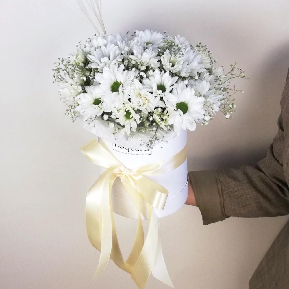 Хризантема и гипсофила в шляпной коробке, цвет белый