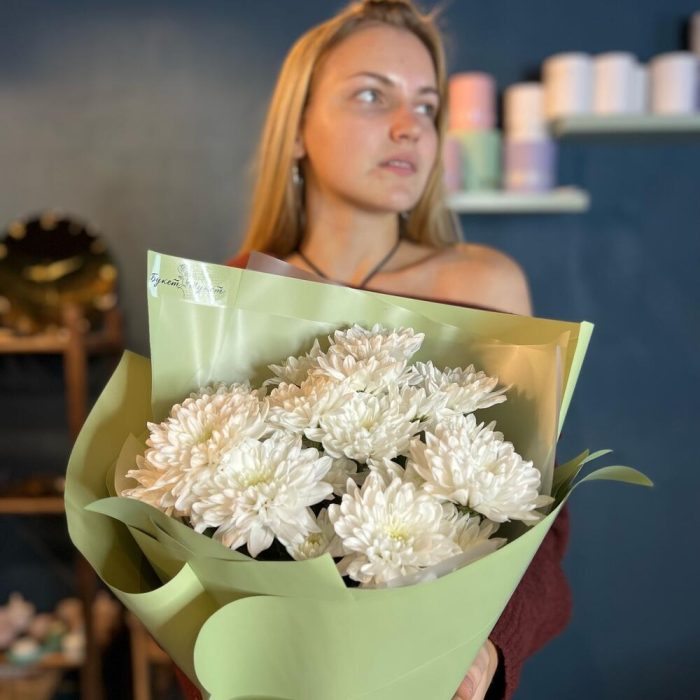 Объемный букет с очаровательными белыми хризантемами!В зависимости от сезонности цветов, мы можем немного изменить состав букета, сохраняя гамму и настроение композиции.Так как все цветы индивидуальны, как люди, букеты с одним и тем же составом тоже могут немного отличаться, но мы стараемся максимально приблизиться к картинке. Мы — очень творческая команда и хотим все силы бросить на создание хороших букетов для вас, поэтому ответственность за доставку мы полностью передали в руки команды FlowWow. Поэтому мы только подготавливаем ваши заказы и фотографируем их для вас перед доставкой, а курьеров назначает и контролирует сам агрегатор. Будем благодарны за оценку именно нашей работы, качество композиции и цветка!