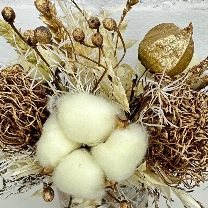 Колосья – 7 шт.Кашпо керамическое – 1 шт.Оазис флористический – 1 шт.Гелихризум – 3 шт.ларгус – 10 шт.гипсофила стабилизированная – 3 шт.леукондендрон – 2 шт.Хлопок – 3 шт.