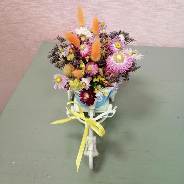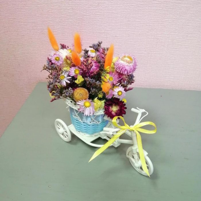 Гелихризум – 15 шт.Лагурус (сухоцвет) – 5 шт.Лимониум – 1 гр.Статица – 1 шт.Оазис флористический – 1 шт.велосипед декоративный – 1 шт.