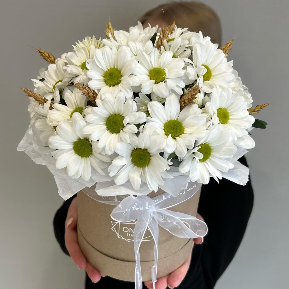 Композиция в коробке из белой кустовой хризантемы и веточек пшеницы