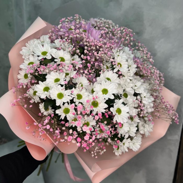 Хризантема кустовая – 15 шт.Гипсофила – 5 шт.Упаковка дизайнерская – 2 шт.Лента атласная – 1 шт.