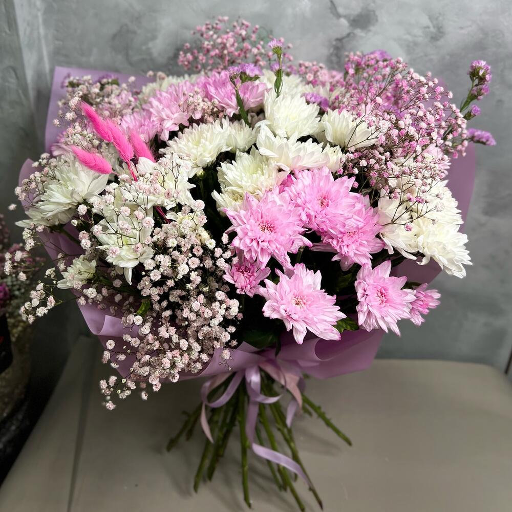 Хризантема кустовая – 13 шт.Статица – 2 шт.гипсофила радужная – 3 шт.Лагурус (сухоцвет) – 5 шт.Упаковка дизайнерская – 2 шт.Лента атласная – 2 шт.