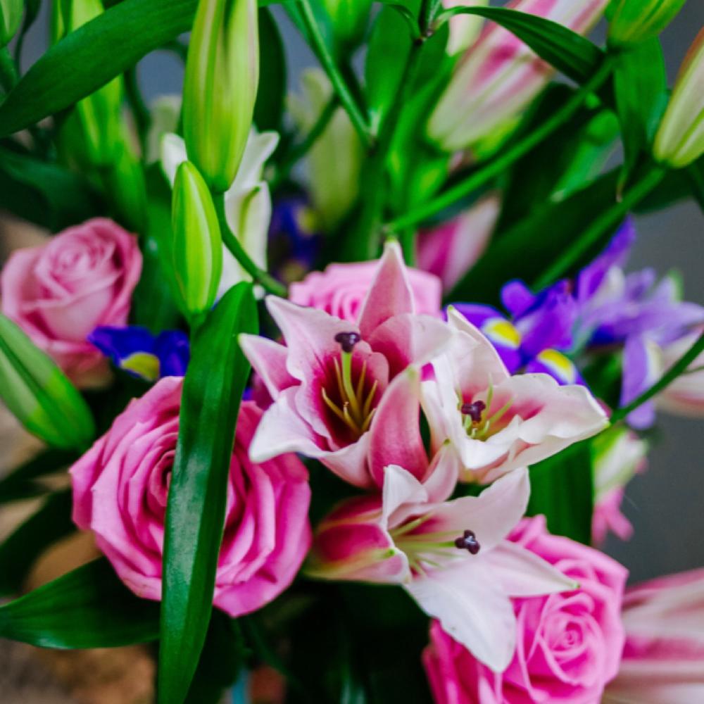 лилии – 3 шт.розы – 7 шт.ирисы – 5 шт.дизайнерская упаковка и атласная лента – 1 шт.