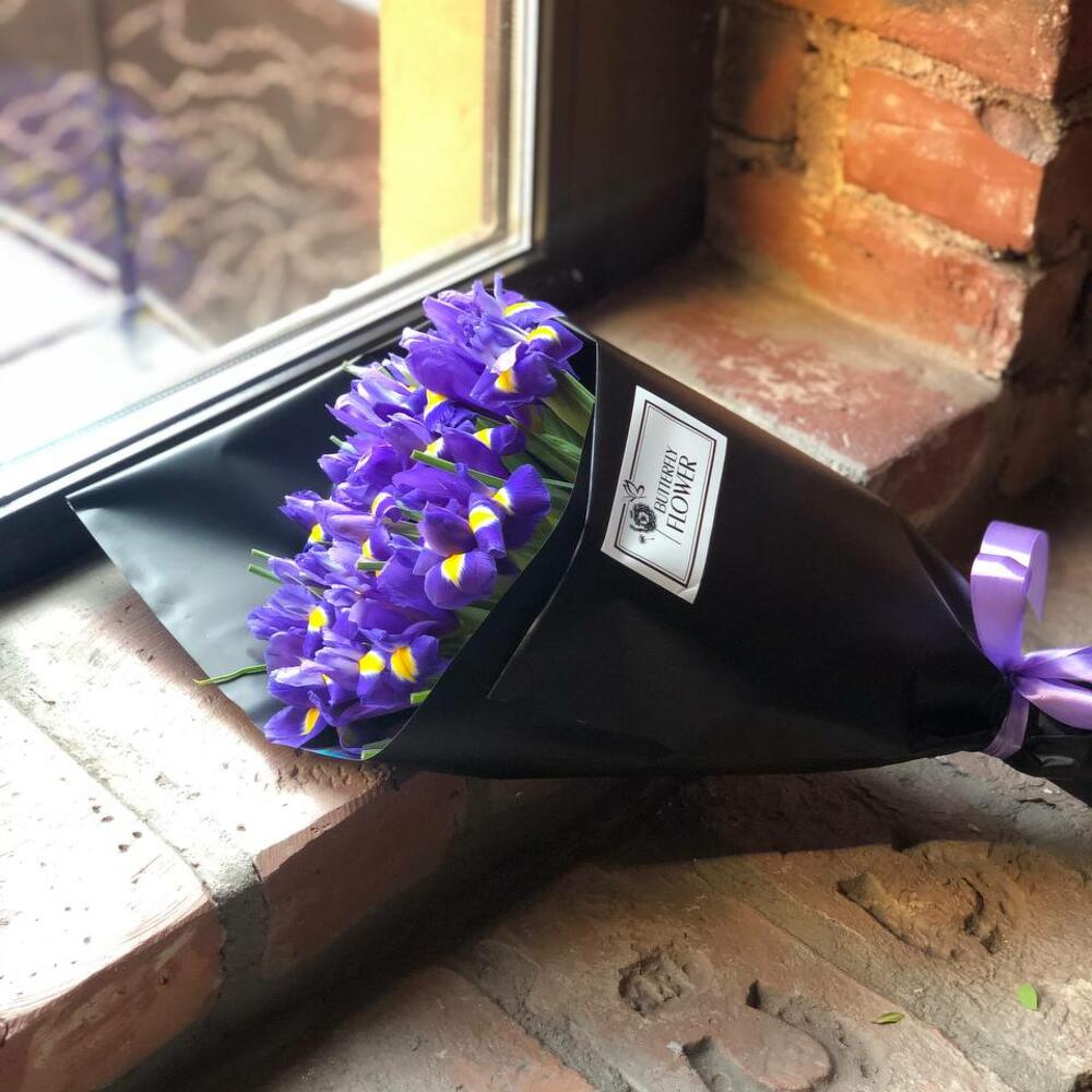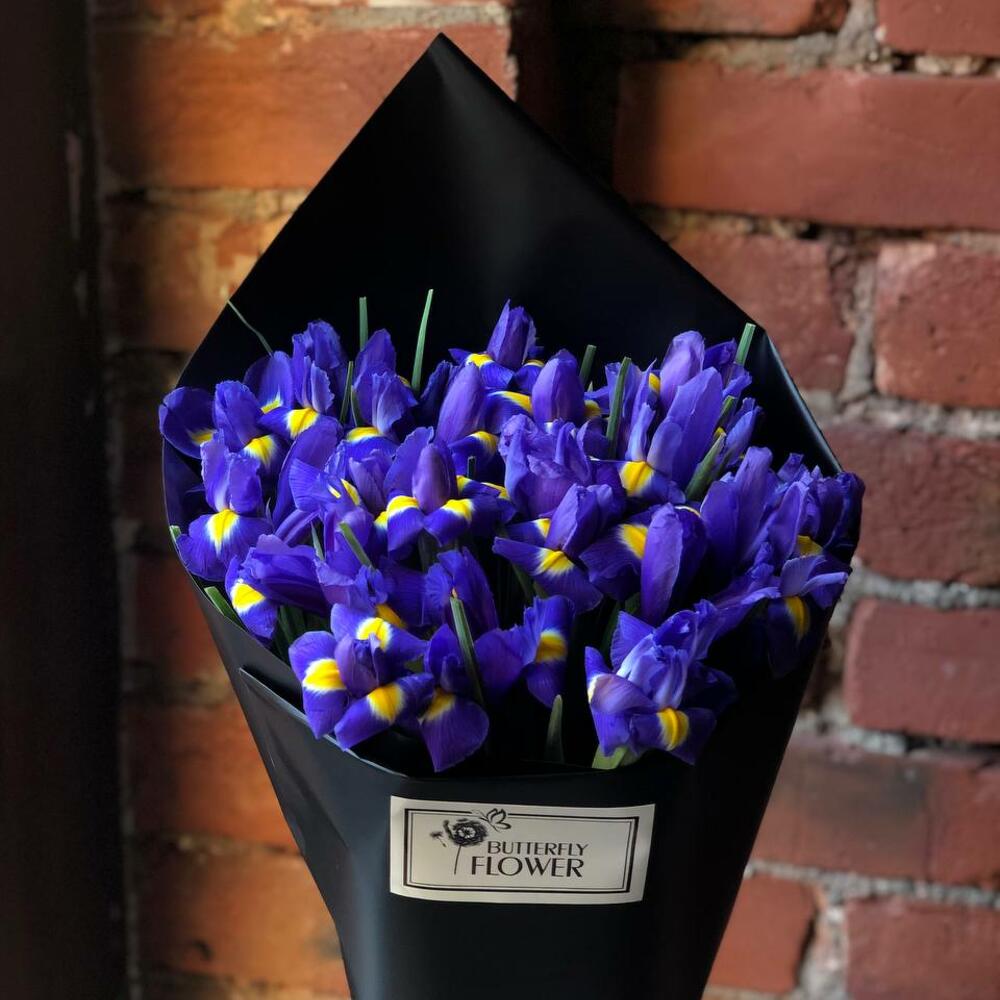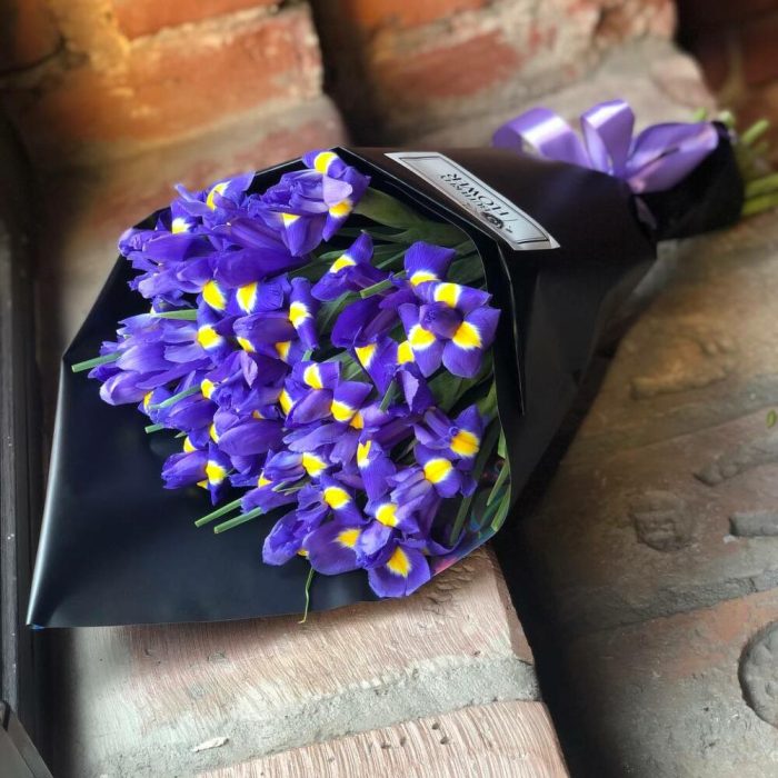 Красивый, яркий букет из 19 ирисов в крафте “Армантьер”